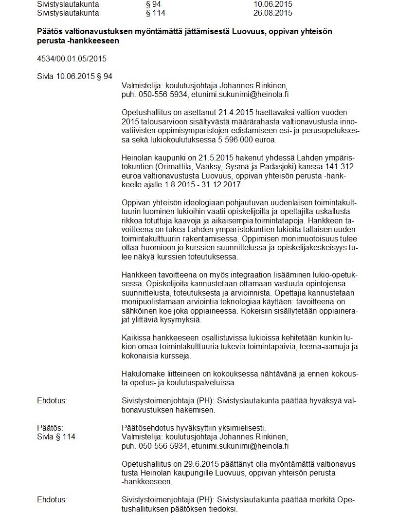 Pöytäkirja 26.08.2015 Pykälä 114