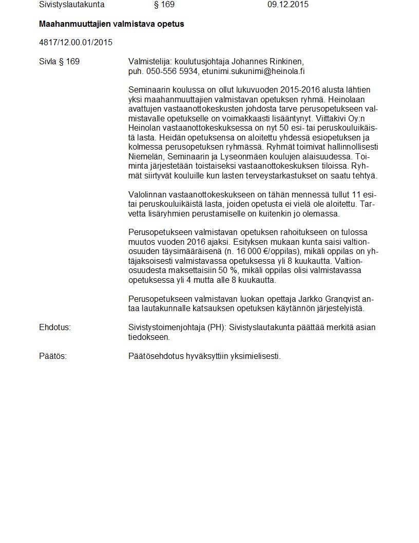 Pöytäkirja 09.12.2015 Pykälä 169