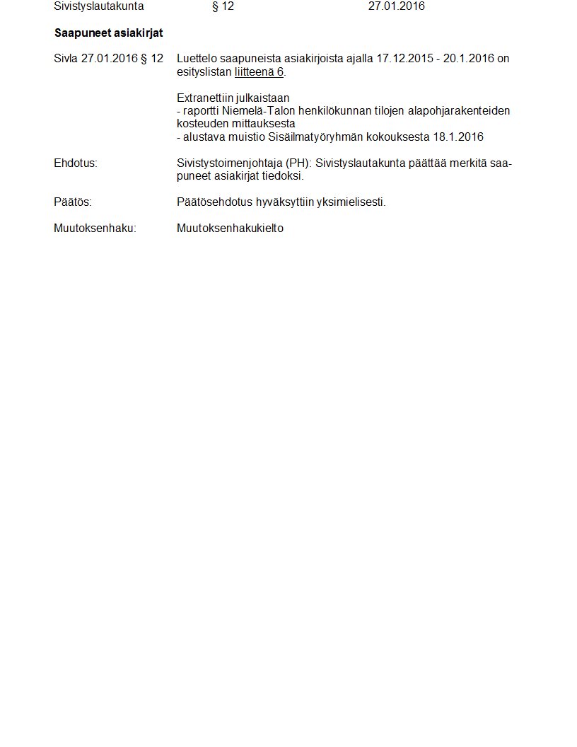 Sivla 27.1.2016 / Saapuneet asiakirjat