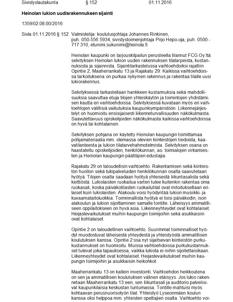 Pöytäkirja 01.11.2016 Pykälä 152